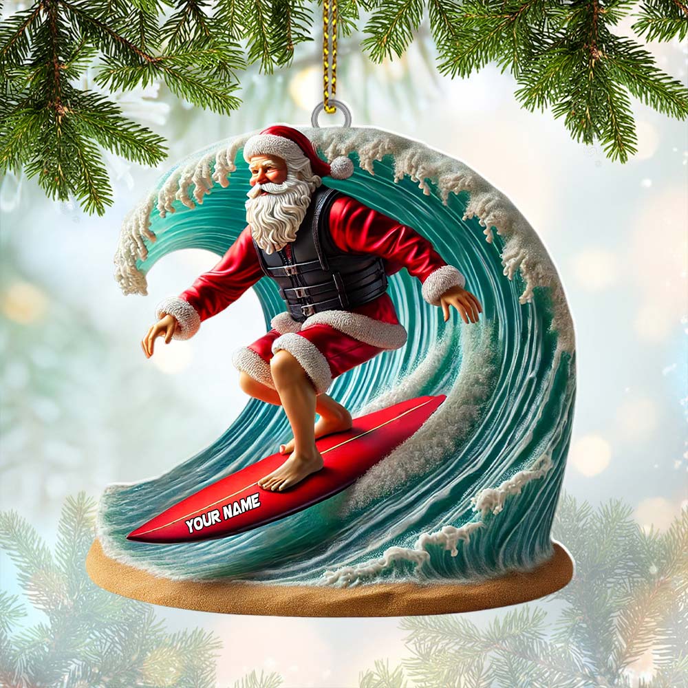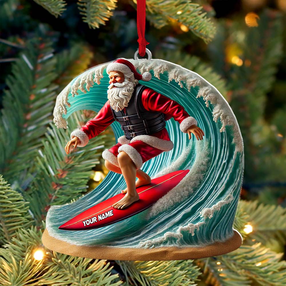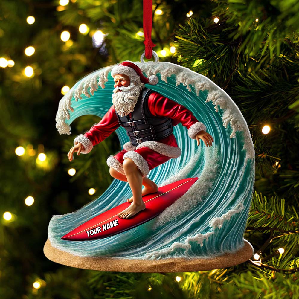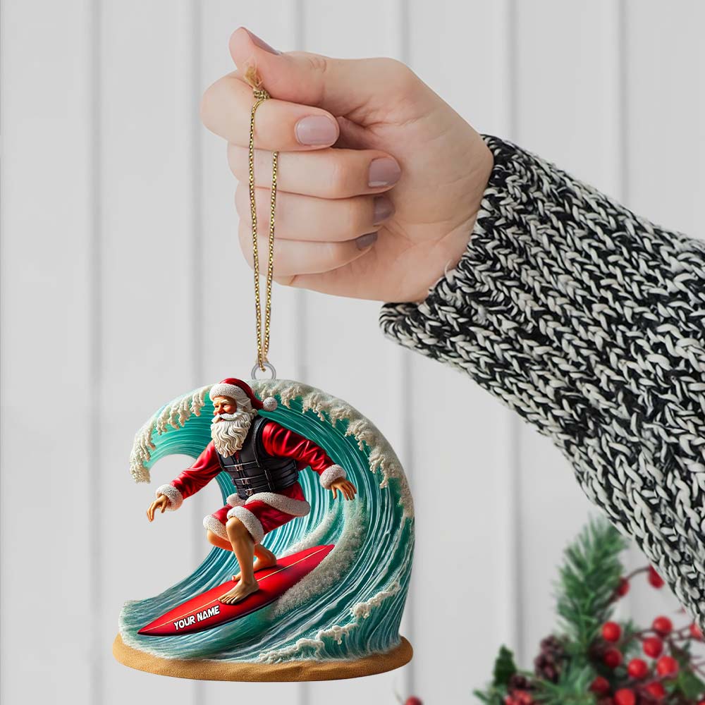 Custom Name Santa Surfing Ornament, Christmas Gift Decoration